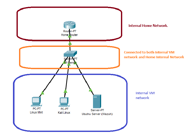 Here’s a visual overview of my homelab network setup. The main goal was to keep the lab isolated from the main home network while allowing all virtual machines to communicate with each other. The single NIC on my server is bridged in Proxmox, connecting the VMs to the switch (Which is pfSense in this case), which lets me experiment with VLANs, routing rules, and firewall configurations via pfSense without affecting other devices at home.